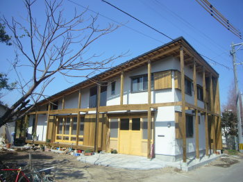 ねじれた屋根の下のワイルドなワンルーム住宅。シラス塗壁や断熱材には杉皮(フォレストボード)玄関には田野の粘土をつかった土間のある自然住宅